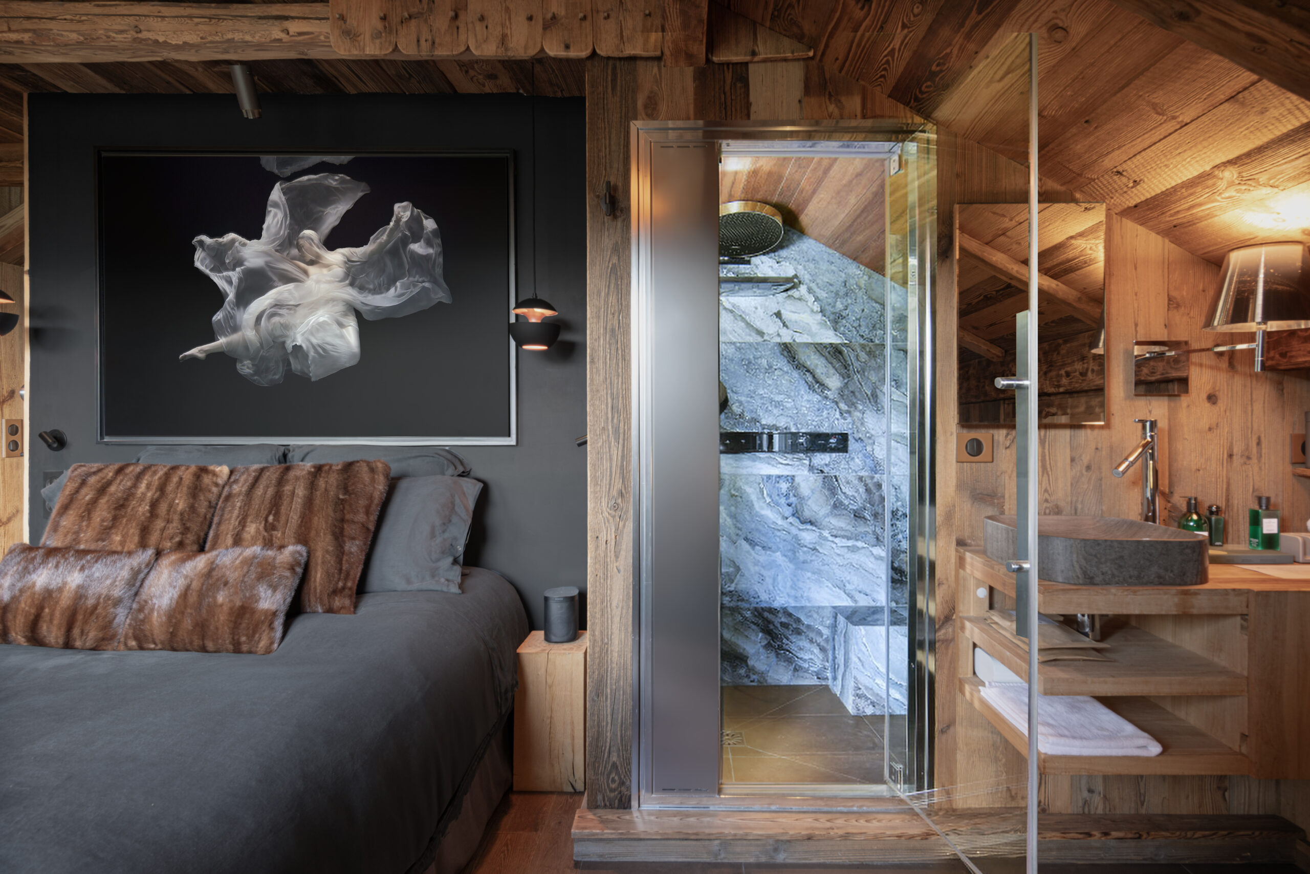The intimate charm of a luxury 5-star Chalet and its private Spa, offering a seamless connection with nature, facing Mont-Blanc.